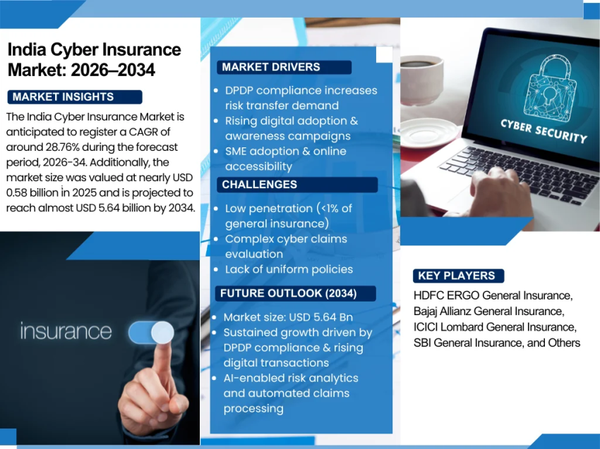 The India Cyber Insurance Market is anticipated to register a CAGR of around 28.76% during the forecast period, 2026-34. Additionally, the market size was valued at nearly USD 0.58 billion in 2025 and is projected to reach almost USD 5.64 billion by 2034.