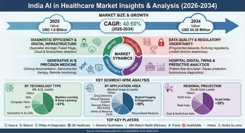 The India AI in Healthcare Market is projected to grow at a remarkable 40.60% CAGR during 2026-2034. The market stood at USD 1.6 billion in 2025 and is expected to reach an impressive USD 34.35 billion by 2034.
