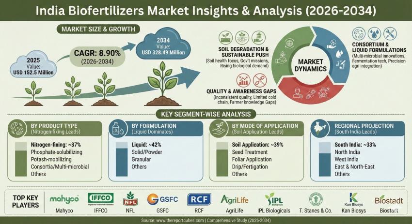 The India Biofertilizers Market is projected to grow at a 8.90% CAGR during 2026-2034. The market stood at USD 152.5 million in 2025 and is expected to reach USD 328.49 million by 2034.